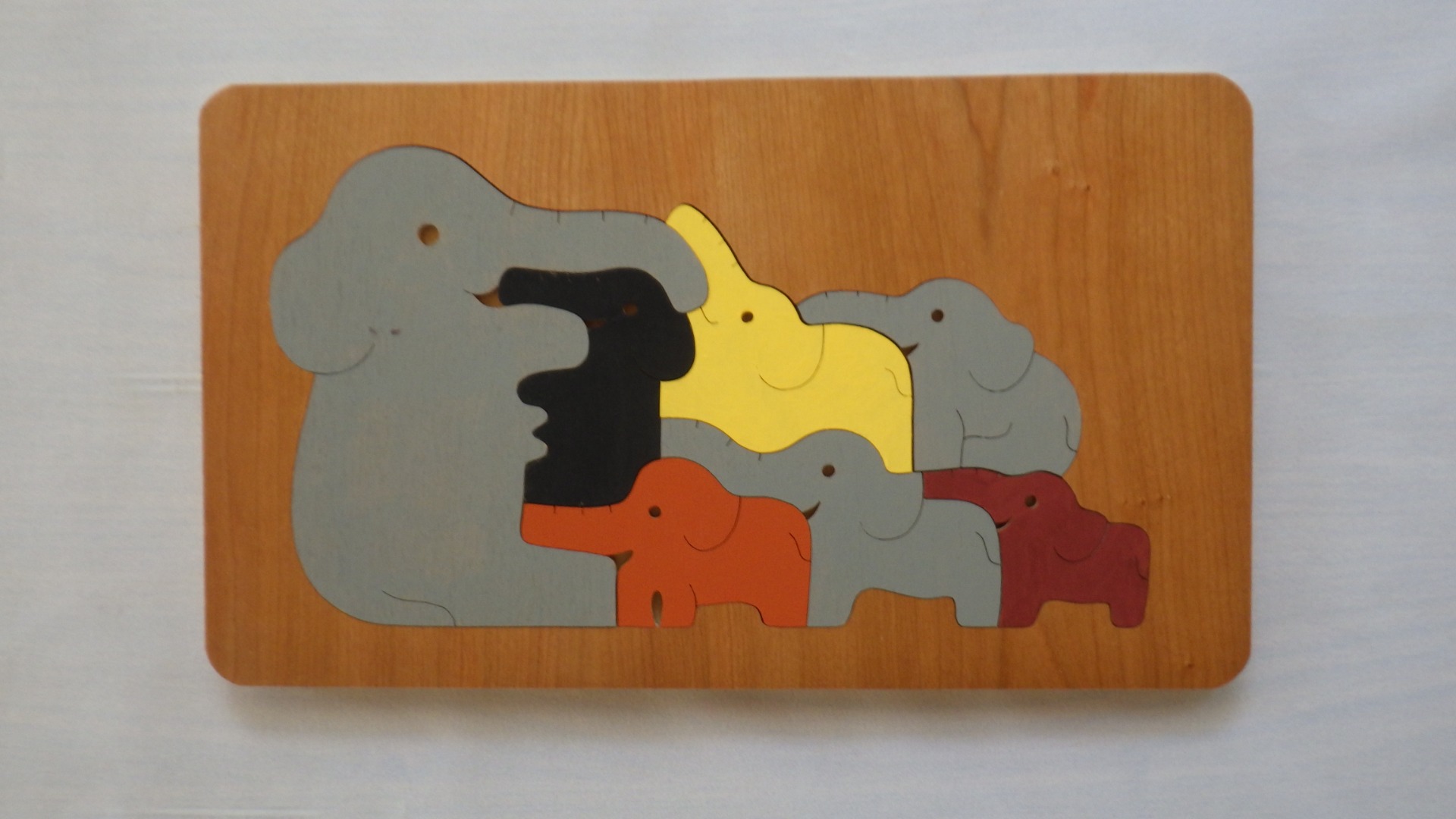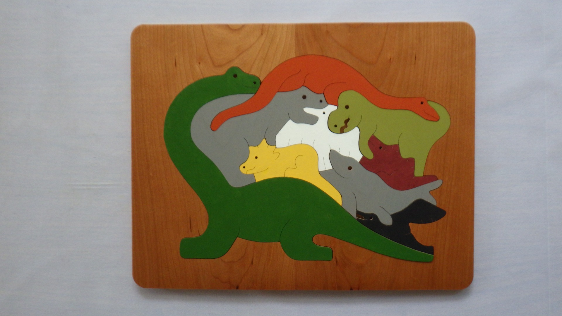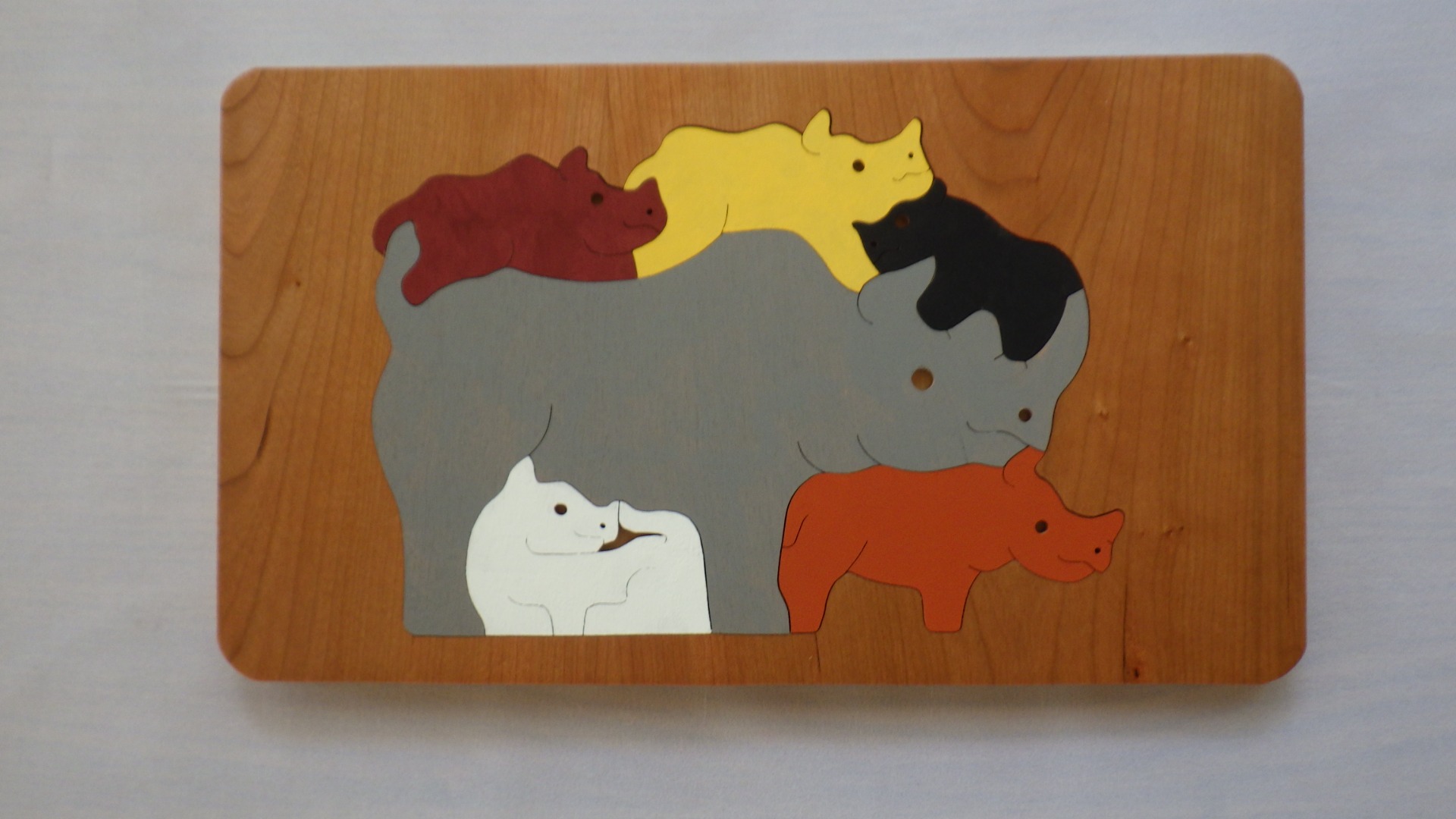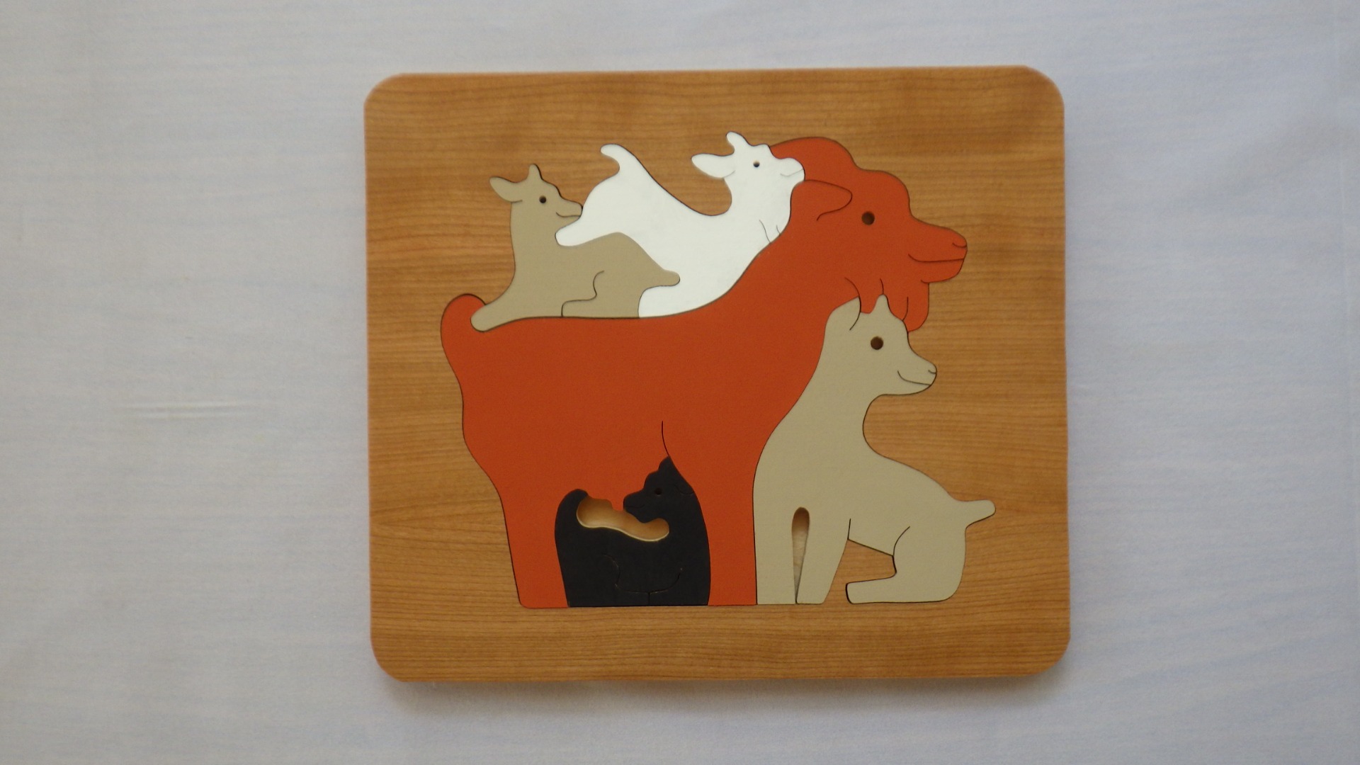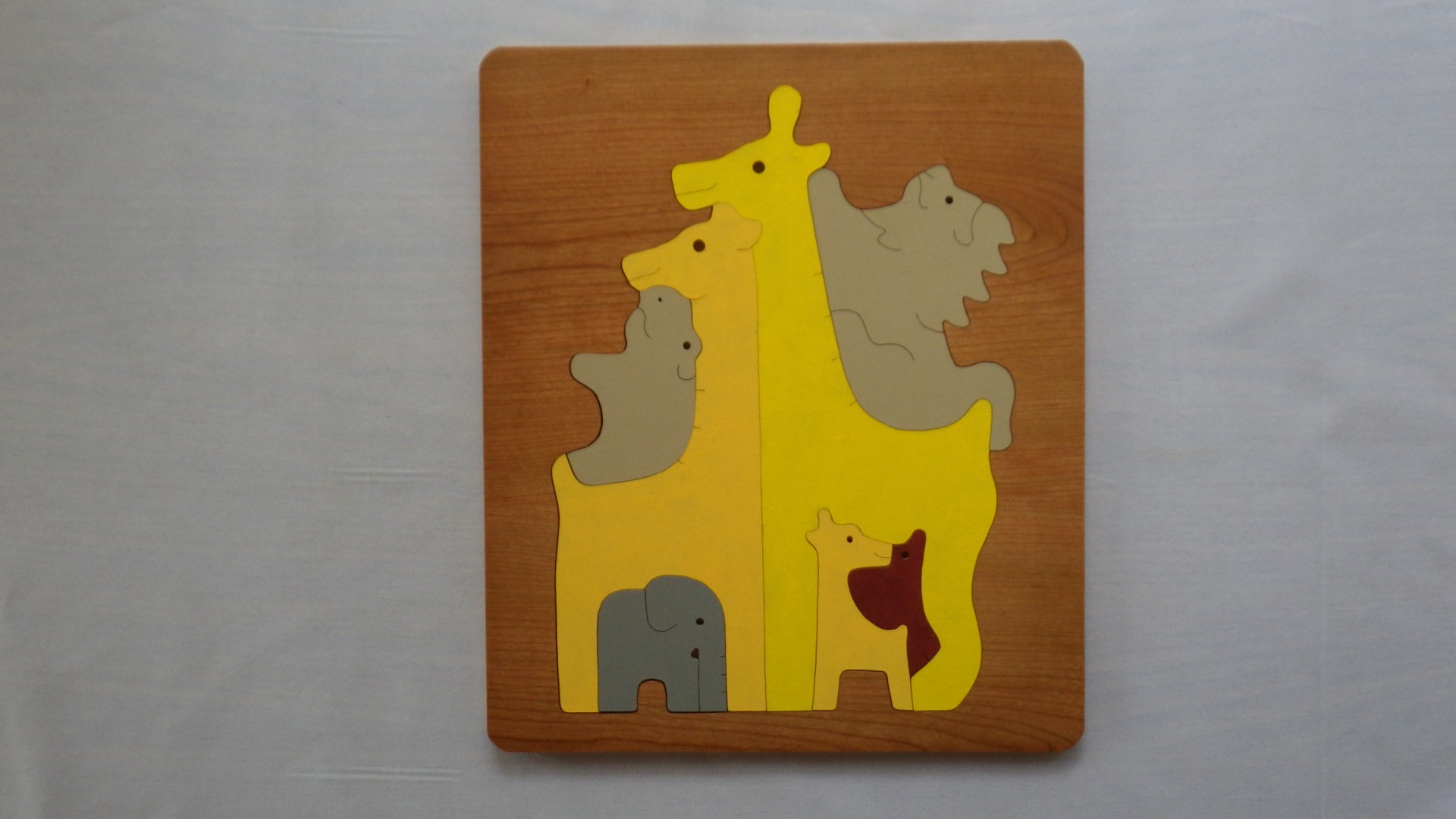 Each puzzle is cut out using a scroll saw. The wood is a cherry laminated ply. The "critters" are all painted with acrylic paints.